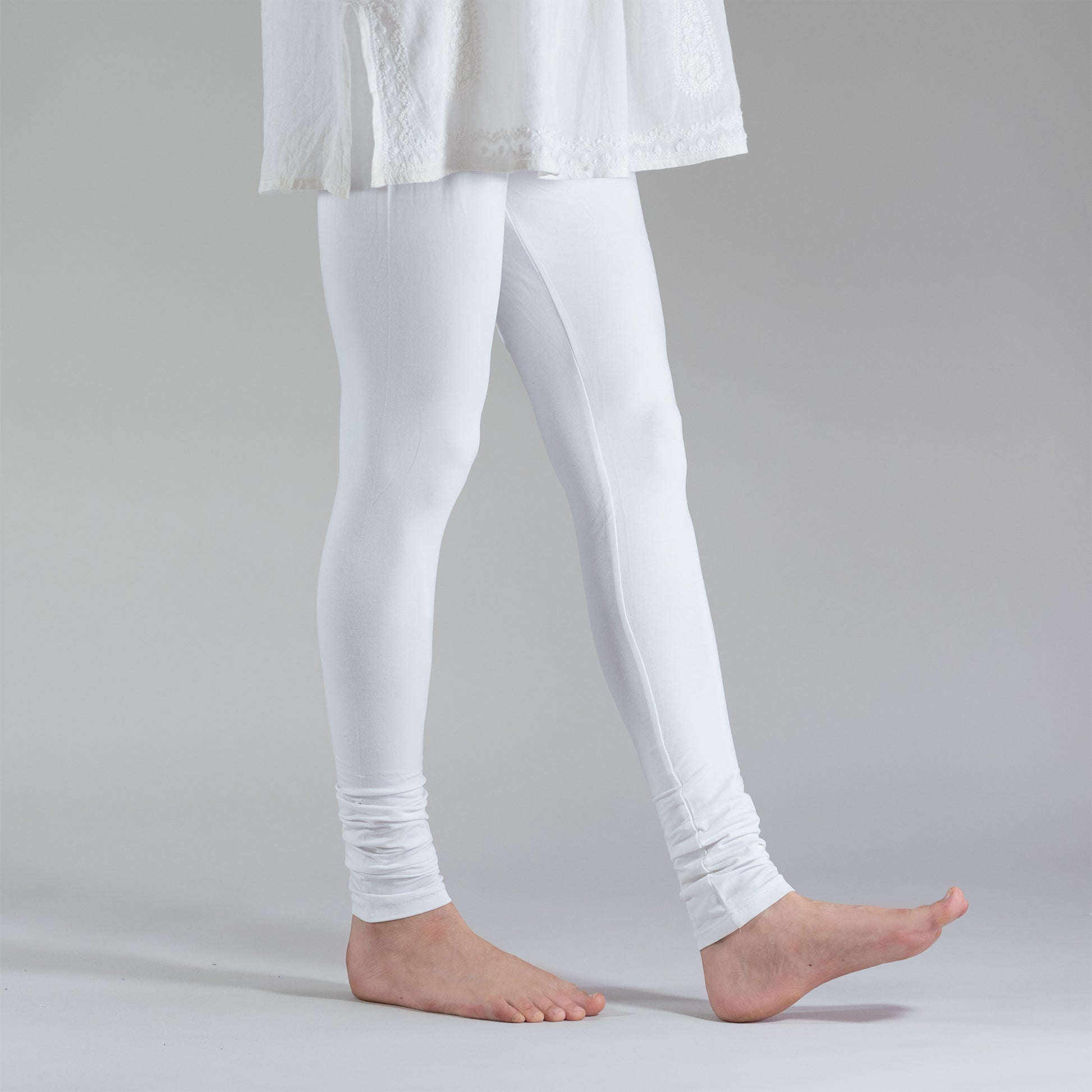 Absolute comfort in buttery-soft, cotton jersey is paired with the traditional, long and narrow shape of India’s classic ‘churidar’ trousers. From Urdu words ‘churi’- bangle, and ‘dar’- like, churidars are designed so you can stylishly gather the extra length to rest on your ankles, and appear like a set of bangles, giving legs a longer look. These Churi Leggings are created for a perfect, incredibly adjustable fit, with a V-shaped yoke at the hips, and a relaxed shape that allows for ease of movement and a wide range of body shapes. Elastic waist with interior drawstring allows this style to be tied high or low at the hips, according to your comfort. Easy to mix and match with a favorite thigh-length or longer top.