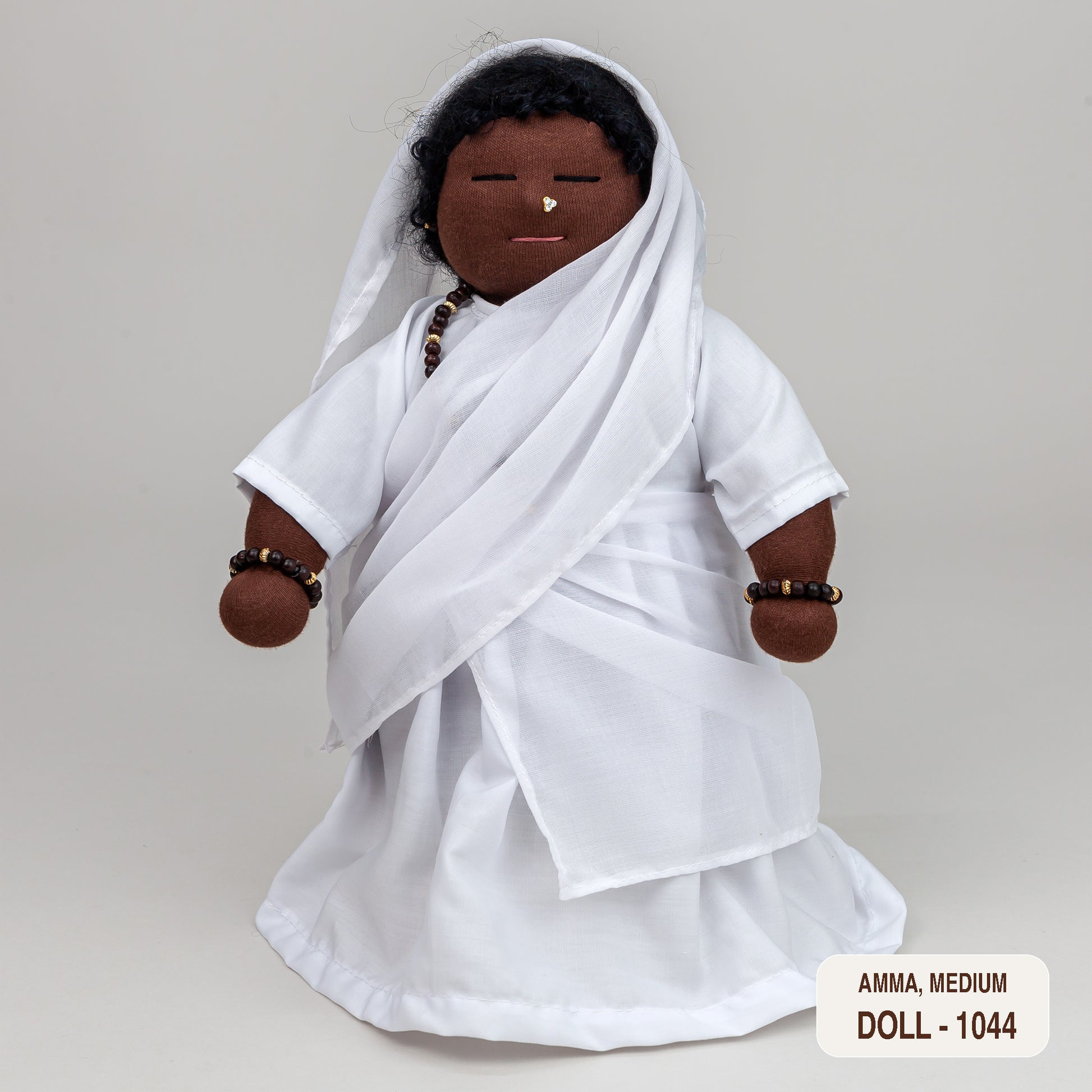 Like Amma herself, our Amma doll is dressed in simple white clothes (a sign of humility and purity). The petticoat, dress and half-sari are all prasad (made from materials used or blessed by Amma). Her bracelets and neck mala are made from red sandalwood beads.