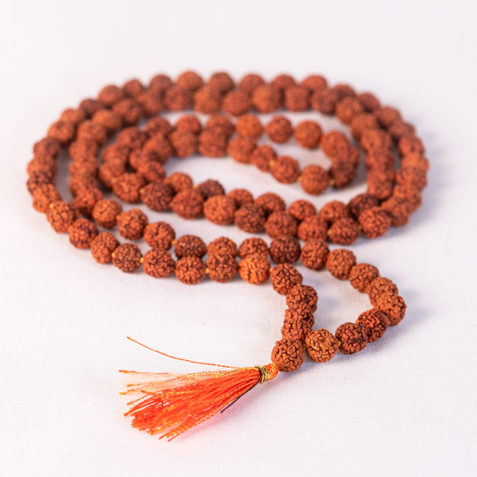Our Shivam japa mala features 108 auspicious Panchmukhi (Five-Faced) 8 mm Rudraksha beads on a hand-knotted cord, with a cotton tassel, wrapped in metallic thread. ‘Rudraksha’ has its origin in the Sanskrit words, ‘Rudra’ and ‘aksha’. Both Rudra and ‘Shivam’ are additional names for Lord Shiva, and aksha means ‘teardrop’. Mythological tales say Rudraksha beads were born out of Lord Shiva’s teardrops of compassion for humanity.
