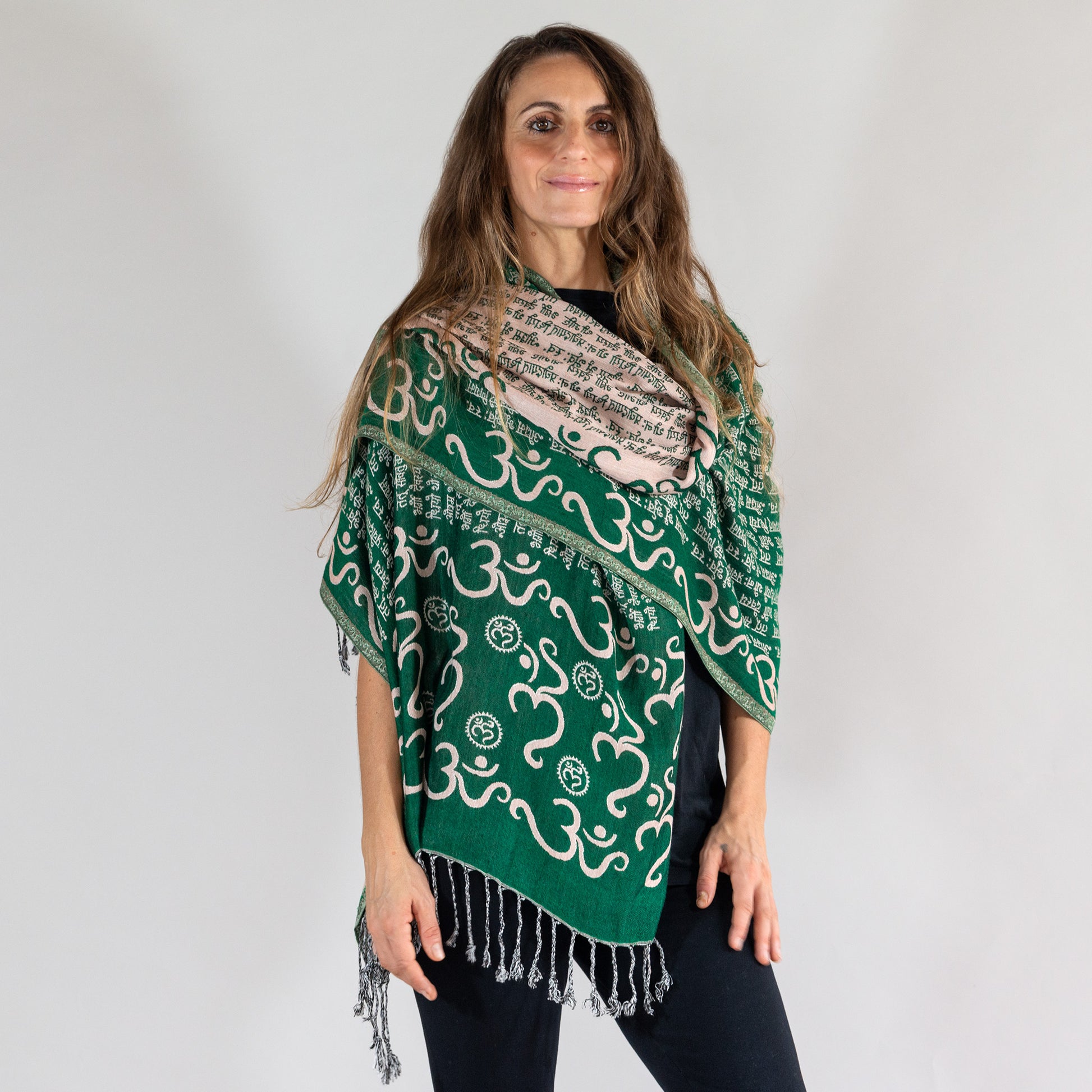 Chanted for peace, protection, and prosperity, the ancient Gayatri Mantra encapsulates all of the Sanskrit Vedas into one universal prayer, and is the highlight of this enchanting shawl. Crafted of soft, natural viscose, with a double-weave technique that creates an inverse color combination on each side. It’s like having two shawls in one!
