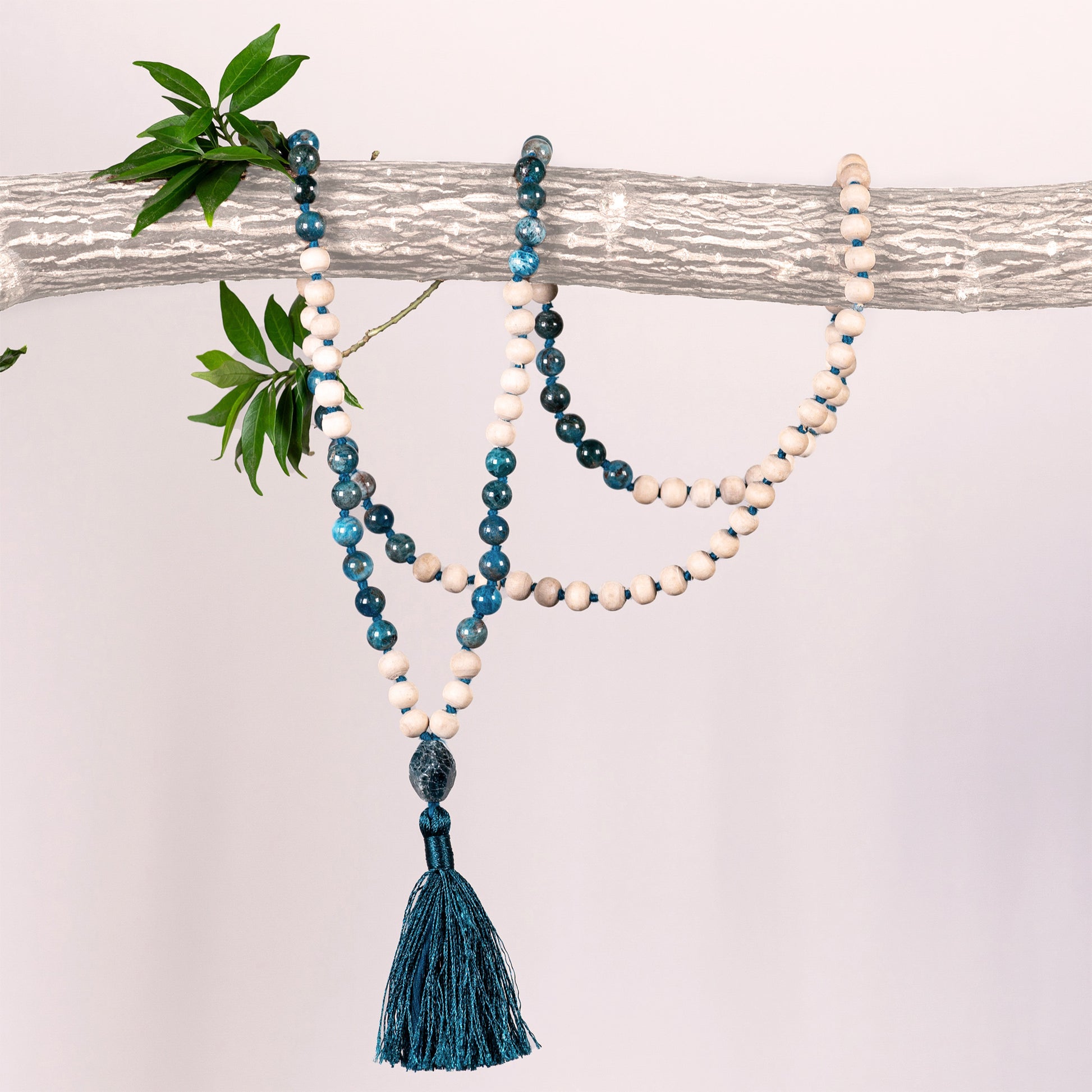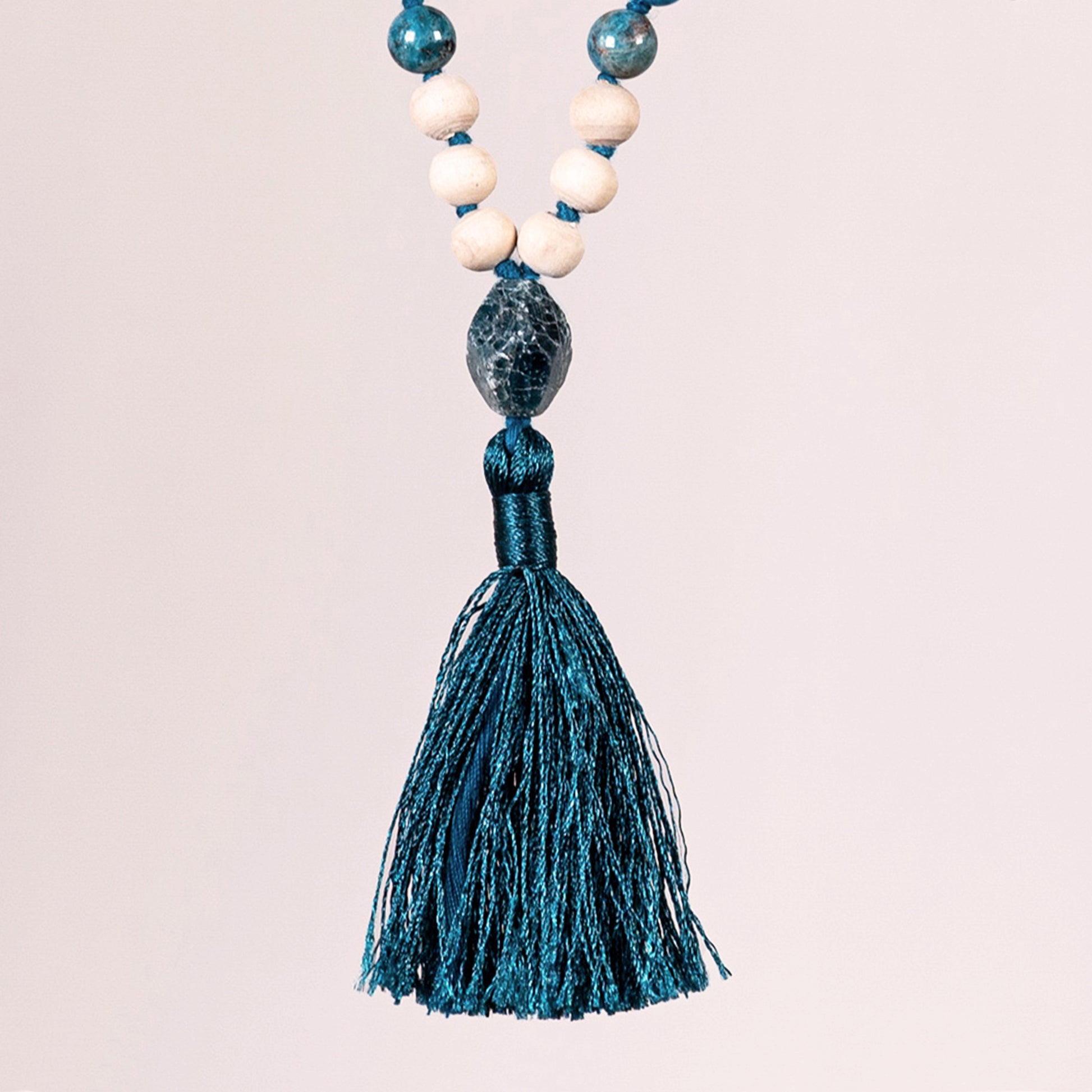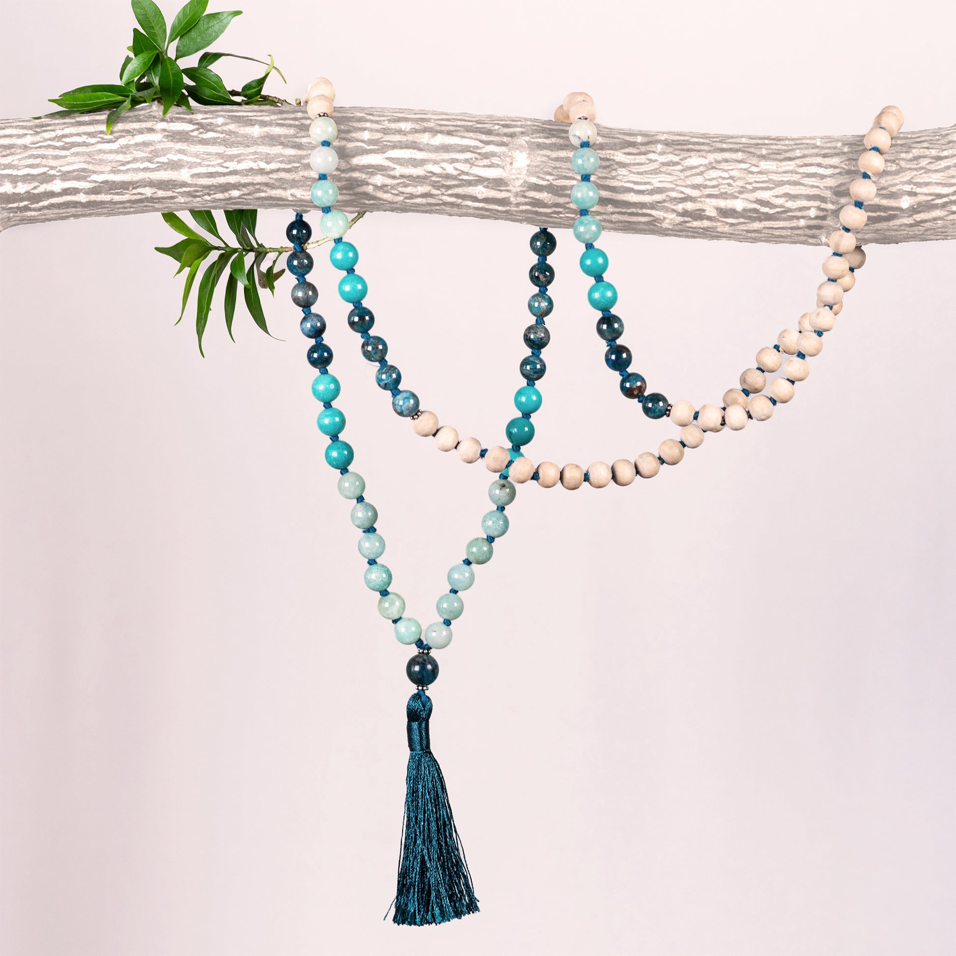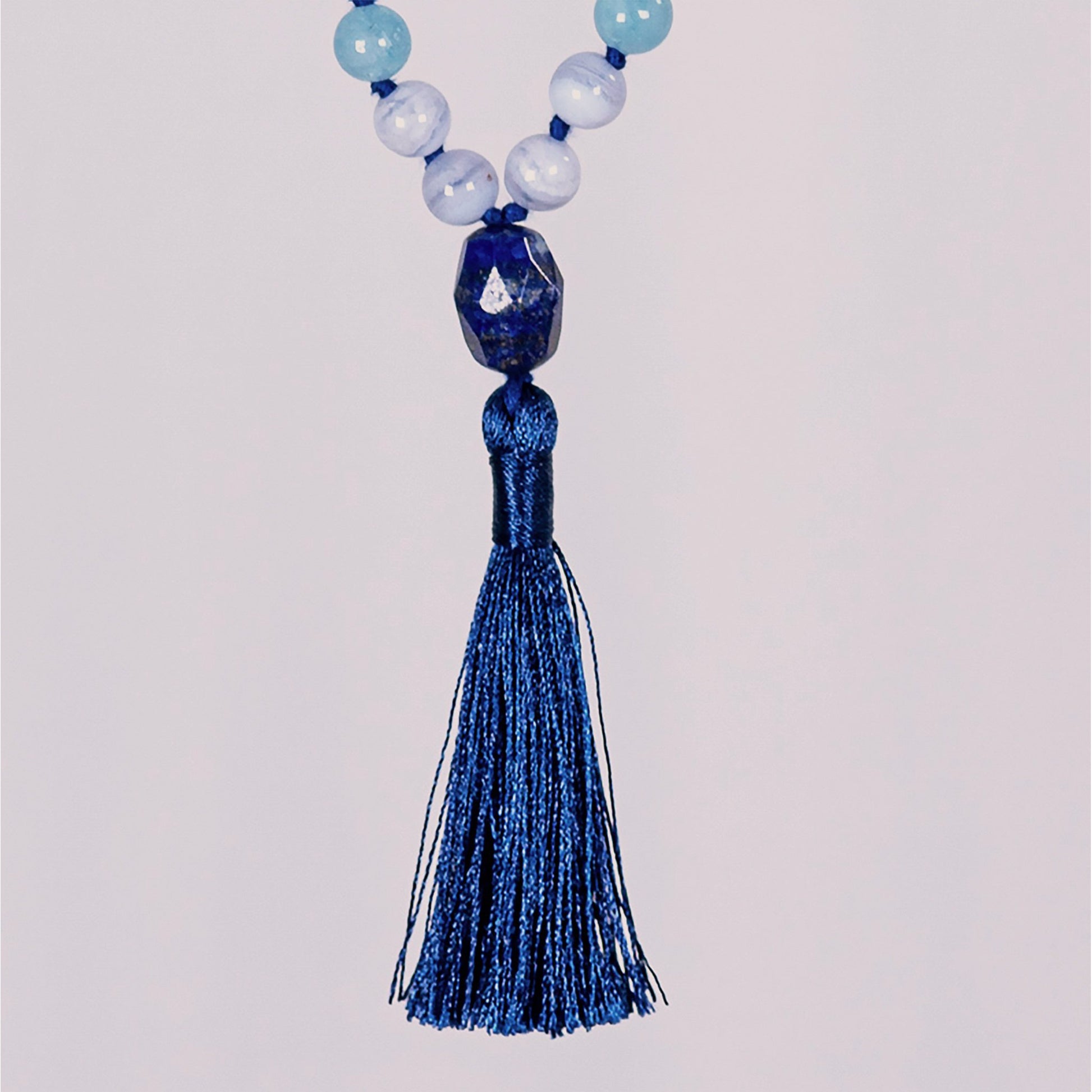 Lord Vishnu is often depicted with a tulsi (holy basil) plant at his feet, with its leaves and flowers decorating them, or in a garland around his neck. The natural, unpolished tulsi beads in our enchanting 108-bead Vishnu Tulsi & Gems Tassel Mala are made directly from tulsi plant wood. The tulsi beads are featured with a glorious hand-knotted arrangement of blue-toned healing gemstones (listed in the color name) and a vibrant silk tassel. The lightness of the tulsi beads makes this mala necklace easy to carry and use for mantra and meditation practices.