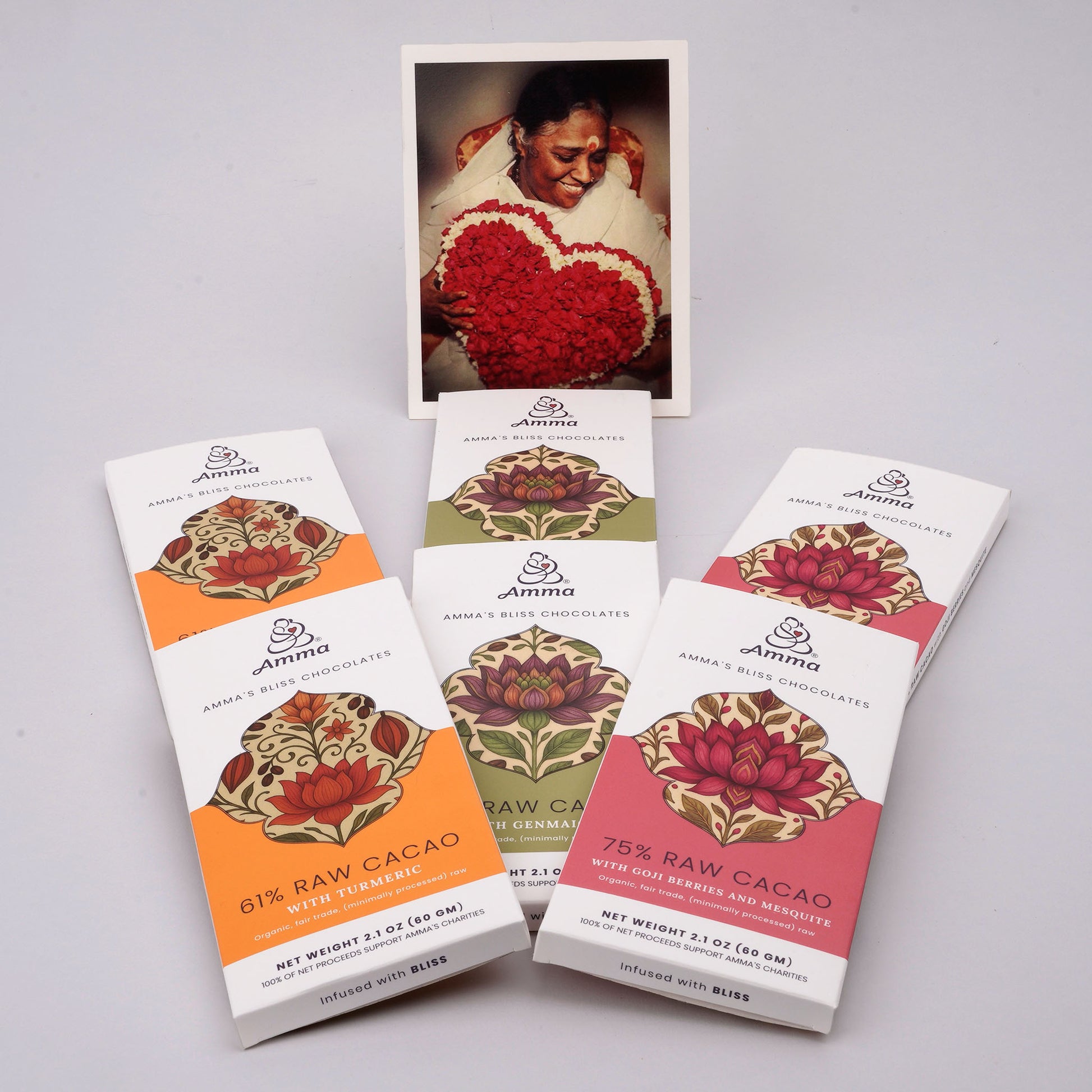 A few years ago, Amma devotees at Amma’s home ashram, Amritapuri, began making chocolates that were sold locally. In 2023, Amma supported the development of a line of truly exquisite chocolates to be sold principally through her North American (and ultimately European) online and North American ashram stores. These chocolates are intended to bring extraordinary chocolate to devotees and chocolate lovers, with all profits supporting Amma’s global charities.