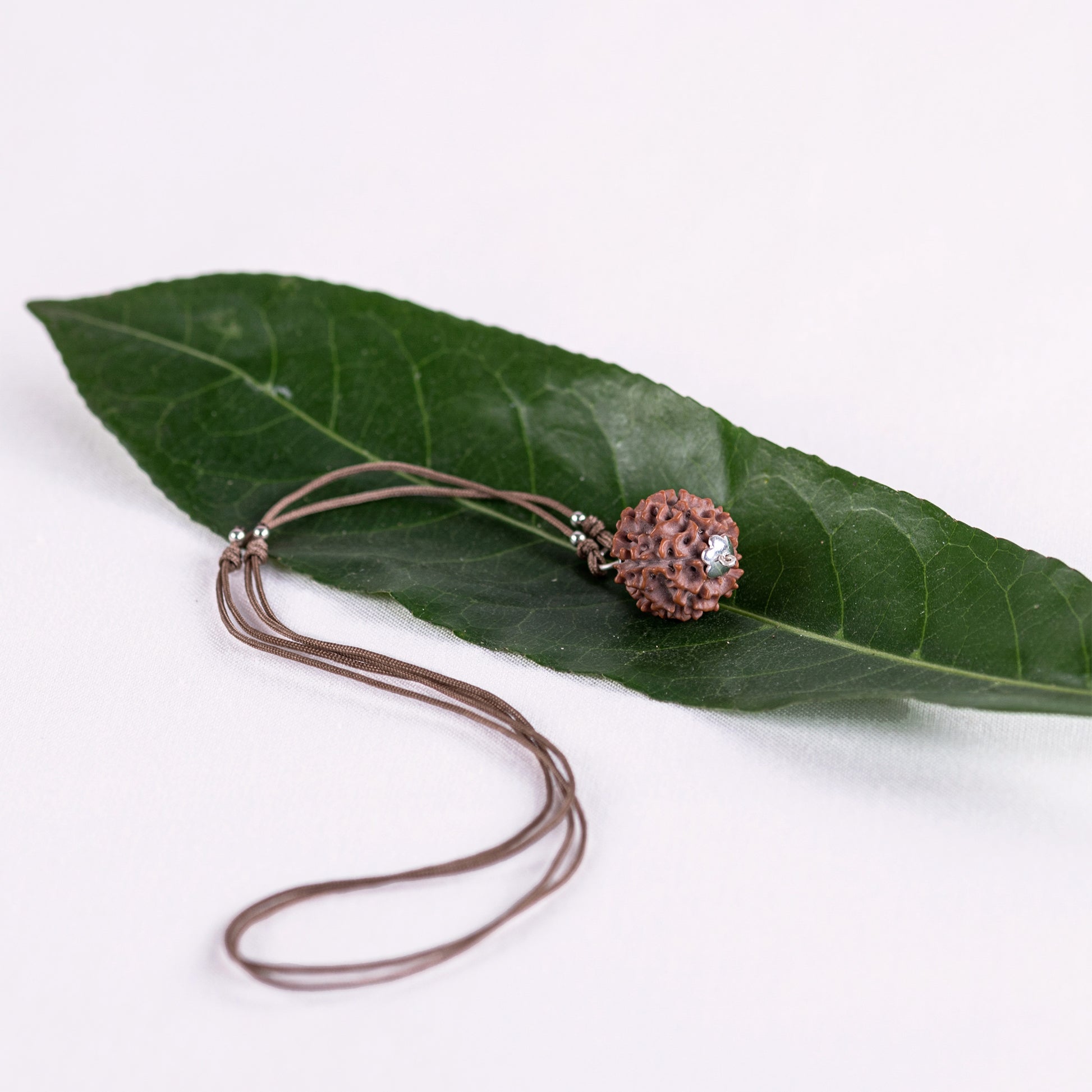 The bead is a Panchmukhi (Five-Faced) Rudraksha seed, known to help bring peace of mind, aid meditation and spiritual practices, and enhance self-awareness. Panchmukhi Rudraksha beads are also said to connect the wearer/seeker directly to the source of existence and pure consciousness. They are believed to protect against negative energies, and considered a blessing to keep and wear, due to their powerful vibrations.