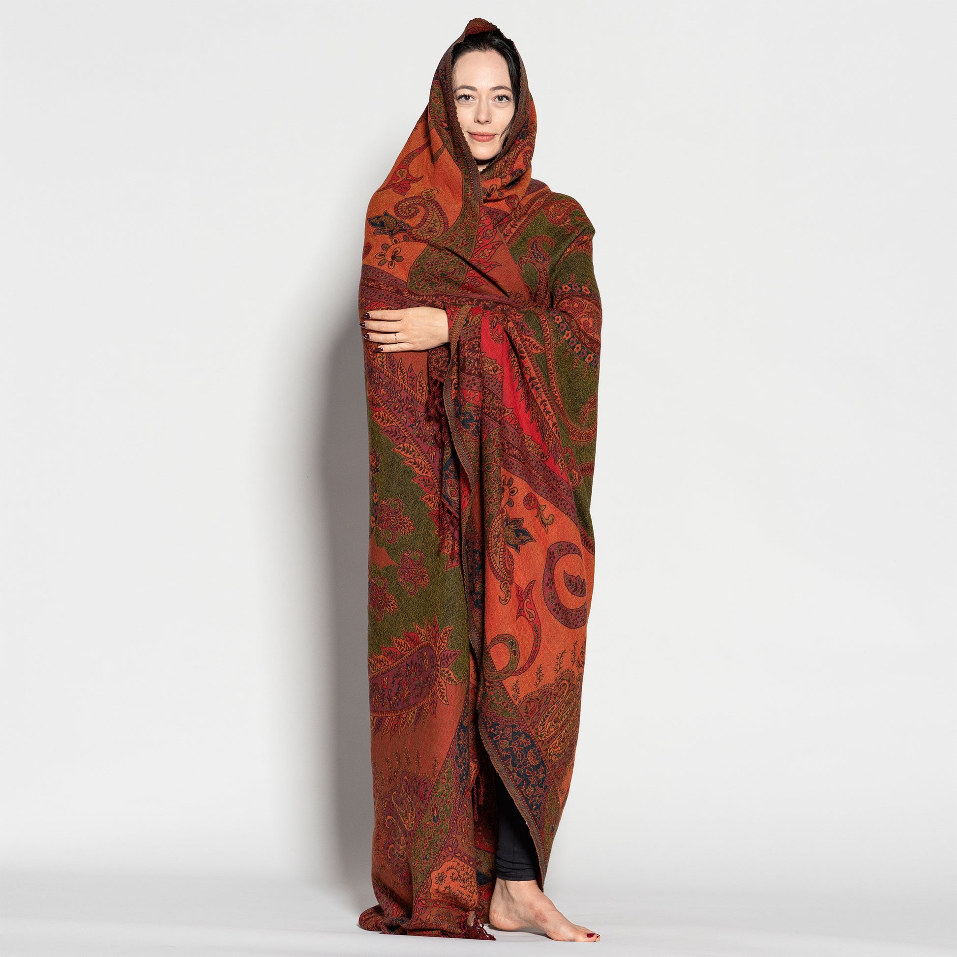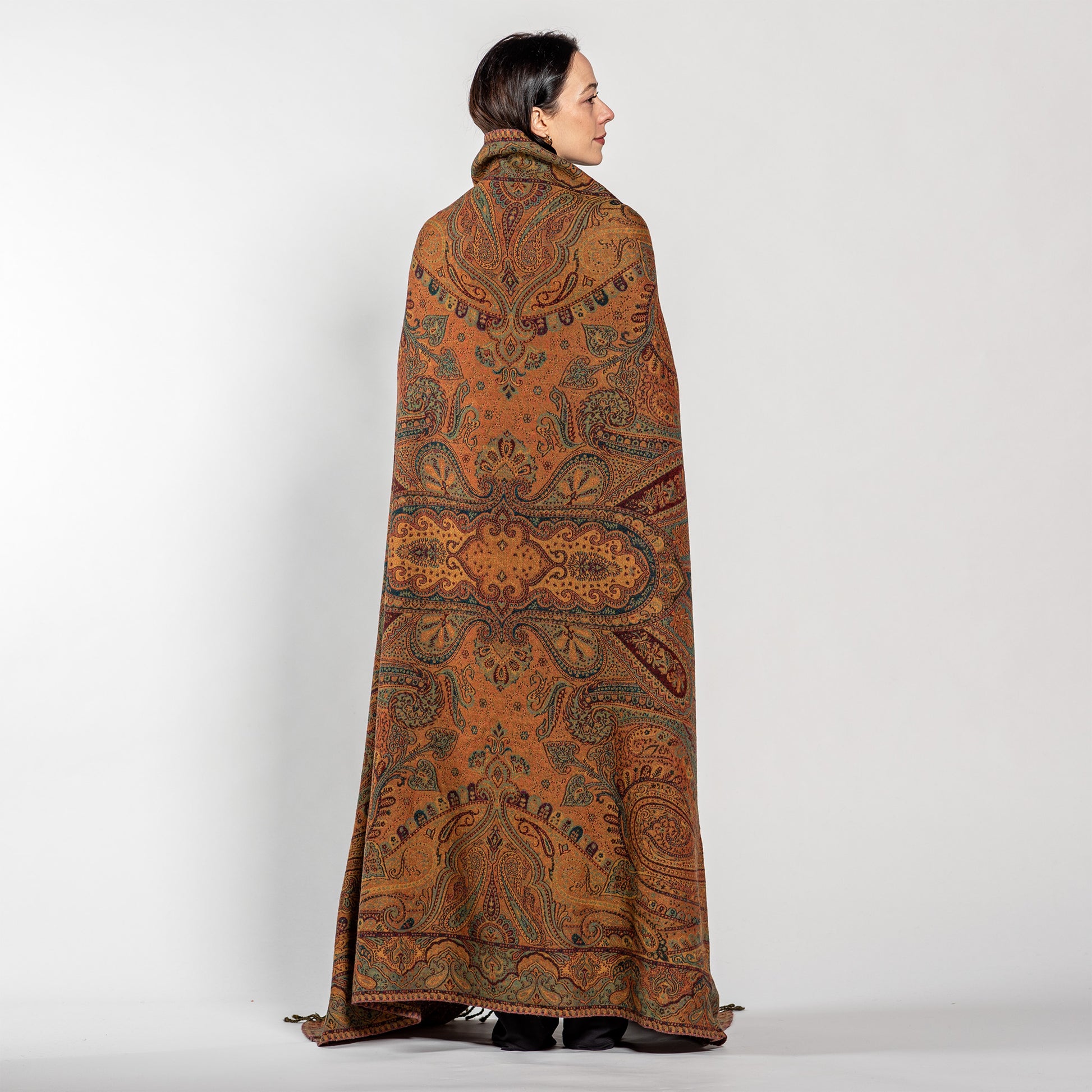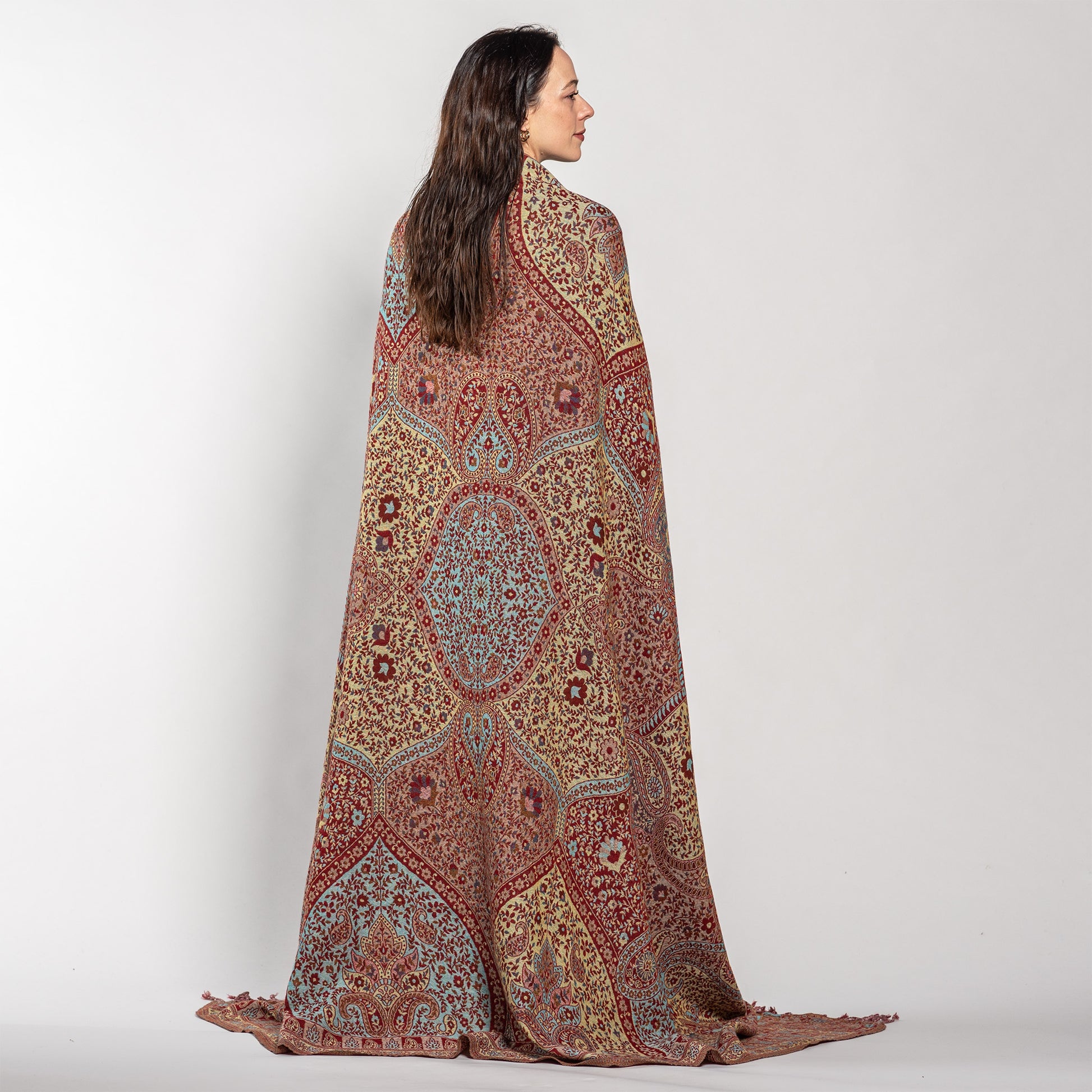 In India, Jamawar shawls were first highly desired by India’s royalty. The handwoven Jamawar shawls we offer today combine the rich color palette of motifs from ancient times, with the easy-care, machine-washable, boiled wool available today. The result is a divinely elegant work of art that can be used in everyday life as a warm and gorgeous fashion wrap, blissful meditation shawl, fabulous travel warmer, exotic sofa throw, or beautiful bedroom blanket.