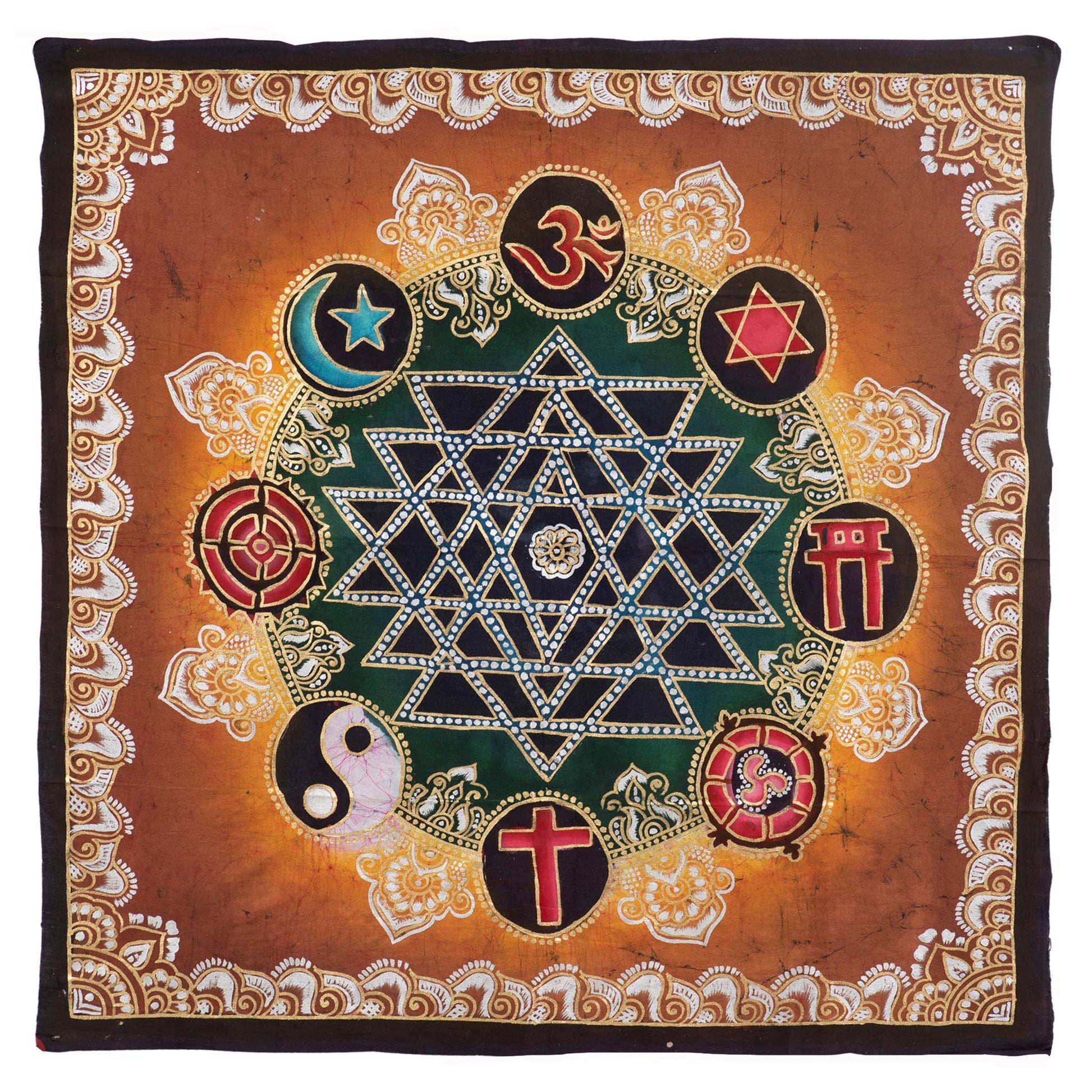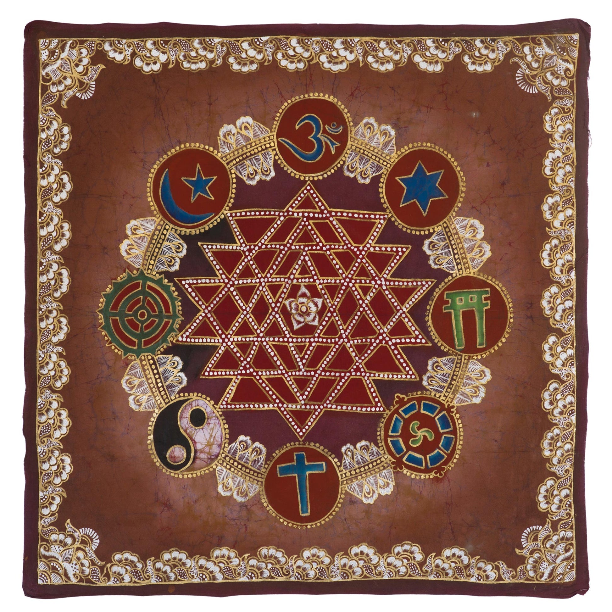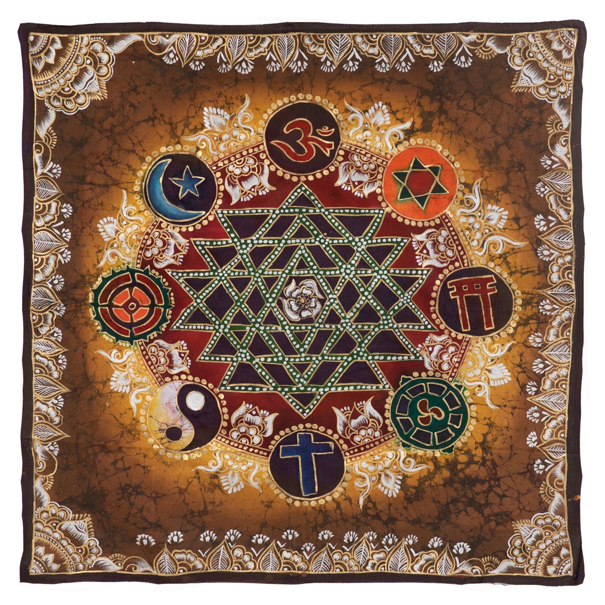Our Unity in Diversity collection celebrates the richness of our world’s diverse beliefs, as well as the unity of all religions and their worship of the one Sacred Truth of God. Each Batik wall hanging features a beautifully hand-painted Sri Yantra-inspired design in the center, surrounded by symbols from some of our world’s many different faiths, including Hinduism’s Letter Aum (Om), Judaism’s Star of David, Shinto’s Torii Gate, Buddhism’s Wheel of Dharma, Christianity’s Latin Cross, Taoism’s Yin and Yang, and Islam’s Crescent and Star. All of the artistic designs of the religious symbols shown in the Batik are intended to represent unity in our richly diverse world.